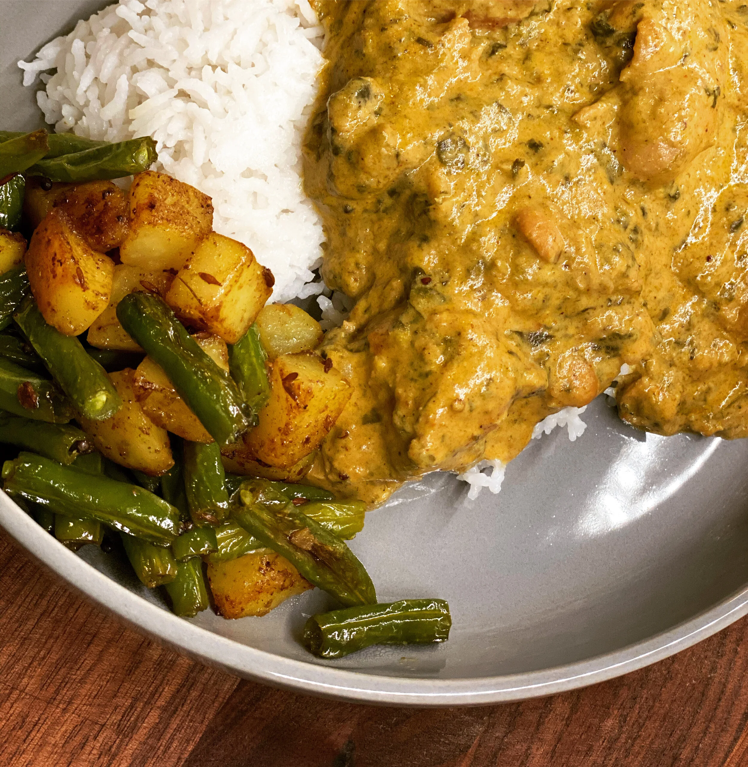 This is where I blend the sauce. While the masala sauce is blending out of the pan, I use the same pot to heat a tbsp of oil and saute the marinated chicken. Brown the chicken and then add the blended masala sauce back into the pot. Stir well. If you want to sneak some veggies in here, sometimes I’ll add some frozen spinach and/or some chickpeas.